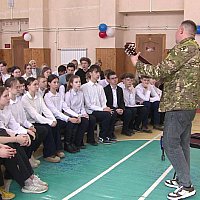 Перед ребятами выступил артист первой фронтовой творческой бригады ансамбля песни и пляски Ленинградского военного округа с позывным "Винил".