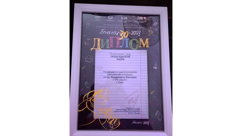 Молодежная редакция ГТРК "Орел" завоевала спецприз председателя жюри, заместителя генерального директора ВГТРК Рифата Сабитова. Отмечена работа Виктории Кондрашиной "Актуальной интервью".