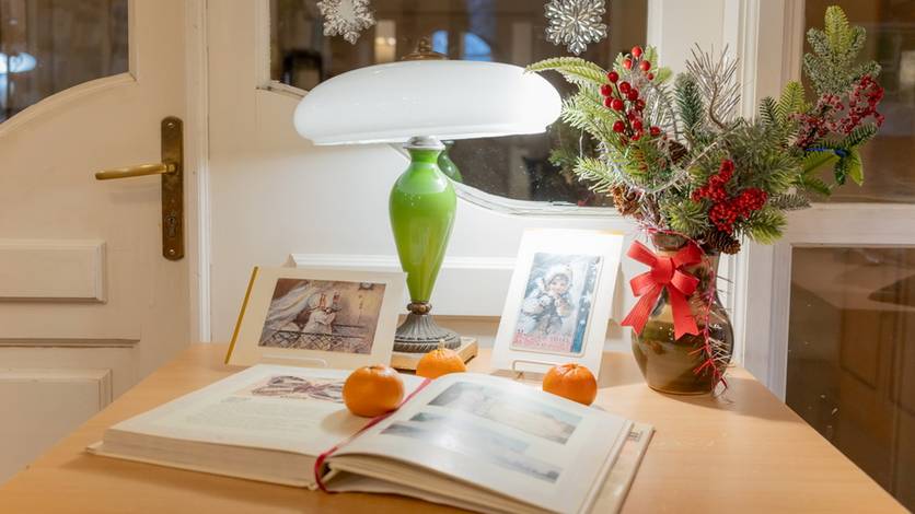 Фото: библиотека имени Ивана Бунина В фойе орловской "Бунинки" появились специальные фотозоны, посвященные Новому году и Рождеству. Главная композиция состоит из красиво украшенной елки, расположившихся под ней подарков и домика со светящимися окнами, а центре - настоящие кабинетные часы с боем.
