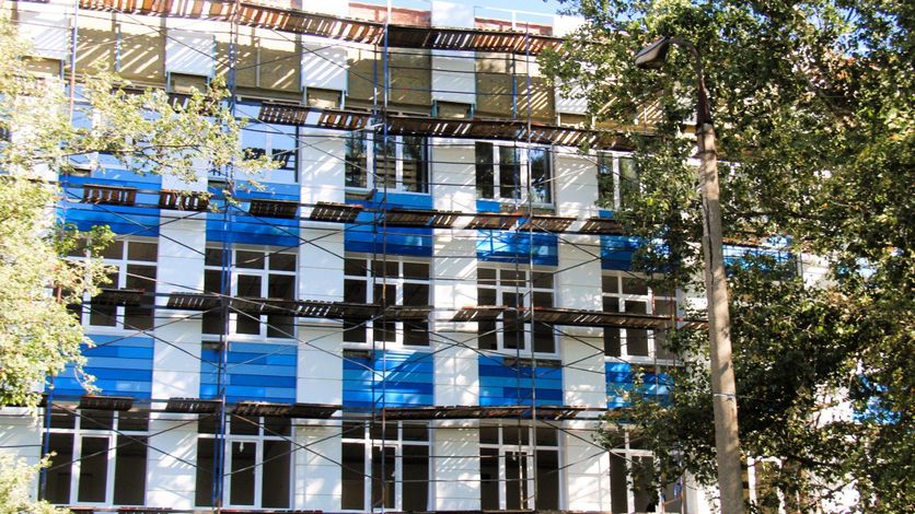 В гимназии № 39 заменили окна на стеклопакеты, утеплили крышу и сделали стяжку. Сейчас идут гидроизоляционные работы. Электрику уже провели. Штукатурные работы выполнены на 50%, а утепление фасада - на 60%.