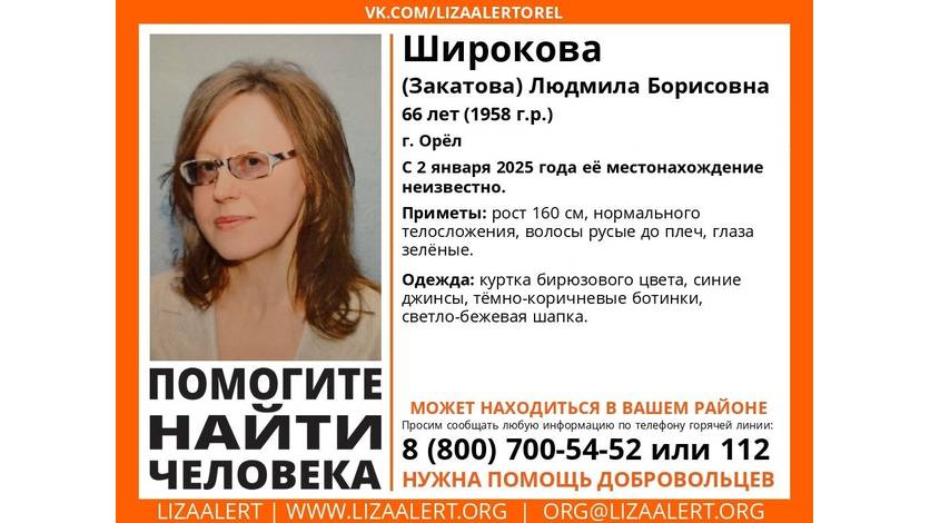 В Орле ищут Людмилу Широкову. По информации поискового отряда "ЛизаАлерт", последний раз женщину видели 2 января 2025 года. Она была одета в бирюзовую куртку, синие джинсы, темно-коричневые ботинки и светло-бежевую шапку.