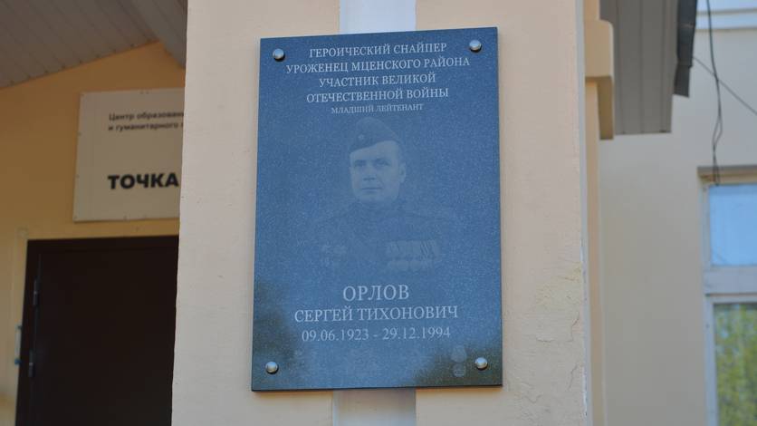 На здании Алябьевской школы Мценского района появилась мемориальная доска в честь ветерана Великой Отечественной войны, легендарного снайпера Сергея Орлова. На открытии присутствовали представители власти, внучка Сергея Тихоновича Оксана Свирская и правнук Андрей.