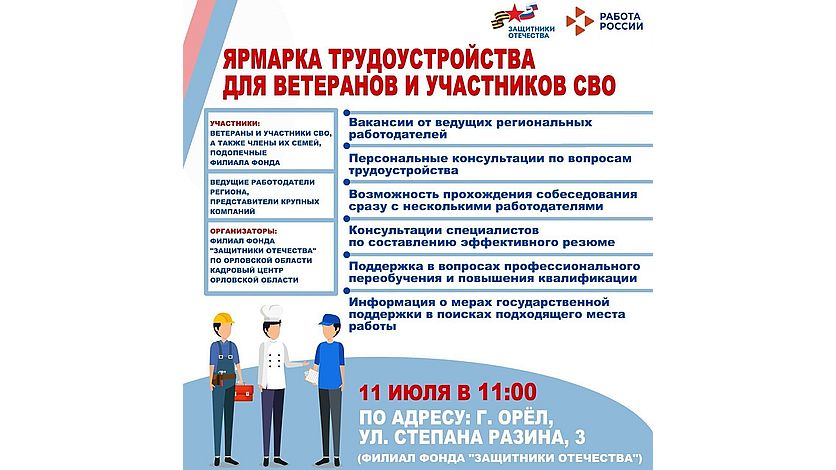 11 июля в 11:00 в филиале фонда "Защитники Отечества" на улице Степана Разина, 3 в Орле пройдет ярмарка вакансий для ветеранов и участников СВО.