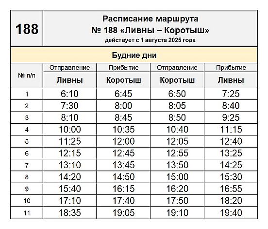 В Орловской области с 1 августа изменится расписание автобуса №188 "Ливны – Коротыш". За новый график проголосовали почти 73% опрошенных.