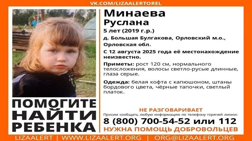 В деревне Большая Булгаковка Орловского округа 12 августа потерялась пятилетняя Руслана Минаева. Информацию об этом опубликовали в поисковой группе "ЛизаАлерт".