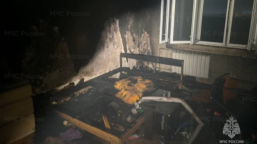 Пожар начался 9 сентября в 00:44 в однокомнатной квартире. В комнате сгорели постельные принадлежности и кровать, весь интерьер покрылся копотью.