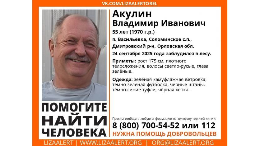 В Орловской области пропал 55-летний житель поселка Васильевка Владимир Акулин. 24 сентября он ушел в лес и до сих пор не вернулся. Об этом сообщает поисковый отряд "ЛизаАлерт".