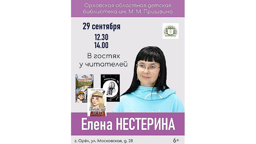— Елена Нестерина пишет приключенческие истории и детективы для подростков, повести о школьной любви и дружбе, сказки. Среди ее произведений: цикл книг про Арину Балованцеву и ее друзей из Братства Белой руки, который насчитывает сейчас 9 повестей и роман "Разноцветные педали", повести "Первое слово дороже второго", "Девочка-тайна", "Мое индейское лето" и другие, — сообщили в пресс-службе орловской областной детской библиотеке имени Пришвина.
