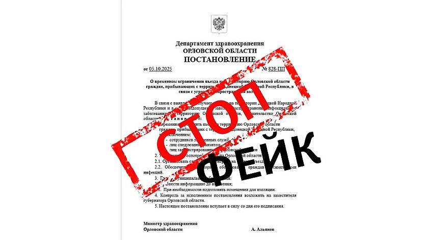 Департамент здравоохранения Орловской области заявил о распространяемом в интернете фейке. В ложном документе предписано ограничение на въезд в регион с территории ДНР – якобы из-за угрозы распространения холеры. Такого постановления никогда не издавалось.