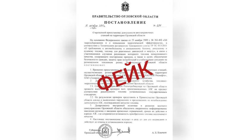 В сети появился новый фейк. Некий документ утверждает, что губернатор Андрей Клычков якобы рекомендовал временно закрыть все автозаправки в Орловской области.