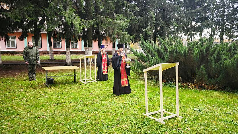 Место будущей часовни по благословению митрополита Тихона освятили настоятель Свято-Троицкого храма Владимир Герченов и клирик Свято-Троицкого храма Сергей Микунов. После богослужения отец Владимир побеседовал с новобранцами и благословил их.