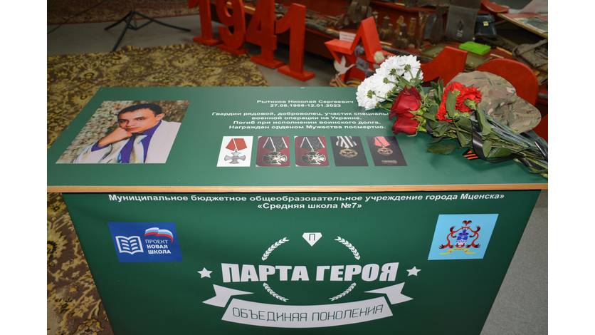 В школе №7 города Мценска открыли "Парту Героя" в честь участника СВО Николая Рытикова. Об этом сообщили в орловском филиале фонда "Защитники Отечества".