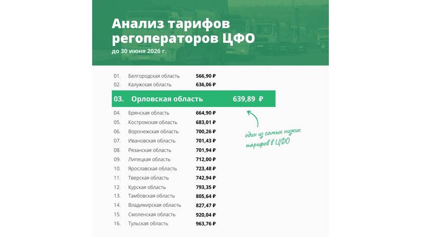 Сохраняя тариф на вывоз отходов на одном из самых низких уровней в ЦФО, минимизируется нагрузка на кошелек орловцев. Для сравнения, в ряде соседних регионов тарифы существенно выше: в Брянской области он составляет 664,90 руб./куб. м, а в Тульской достигает 963,76 руб./куб. м. Таким образом, разница с максимальным тарифом по ЦФО для Орловской области составляет более 300 рублей.