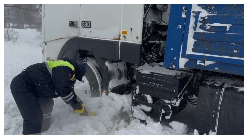 Также инспекторы помогли освободить колеса фуры от сильного снежного наката, благодаря чему водитель большегруза смог ехать дальше.