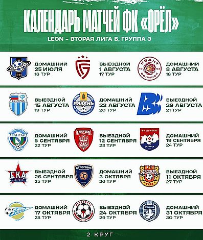 Фото: ФК "Орел", Вторая лига "Б" ФК "Орел" опубликовал календарь матчей команды на предстоящий сезон LEON-Второй лиги "Б". "Зелено-белые" сыграют в группе №3.