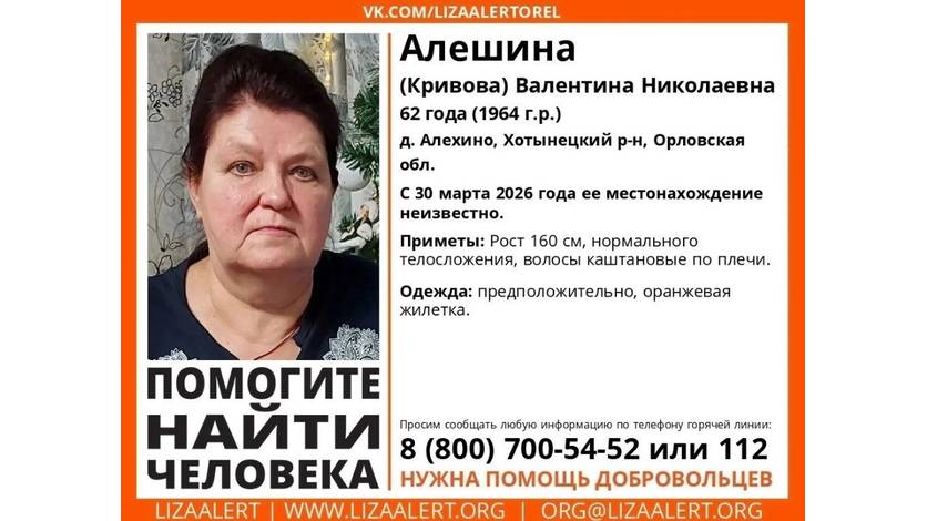 На Орловщине идут поиски пропавшей 30 марта Валентины Алешиной. 62-летняя женщина ушла из дома в деревне Алехино Хотынецкого района. Предположительно, она была одета в оранжевую жилетку.