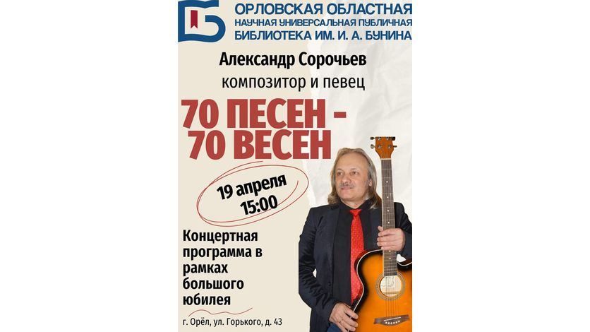 19 апреля в 15:00 библиотека имени Бунина приглашает на концерт, приуроченный к творческому юбилею орловского композитора, певца и мелодиста Александра Сорочьева, сообщает портал правительства Орловской области.