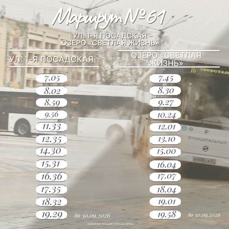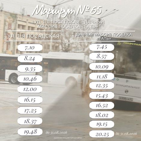 Мэрия Орла опубликовала расписание дачных автобусов. Они начинают работать уже 18 апреля. В областной столице это маршруты №20Д, 61 и 65. Расписание представлено в прикрепленных карточках от городской администрации.