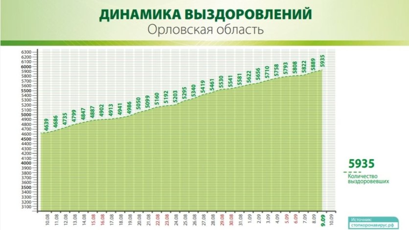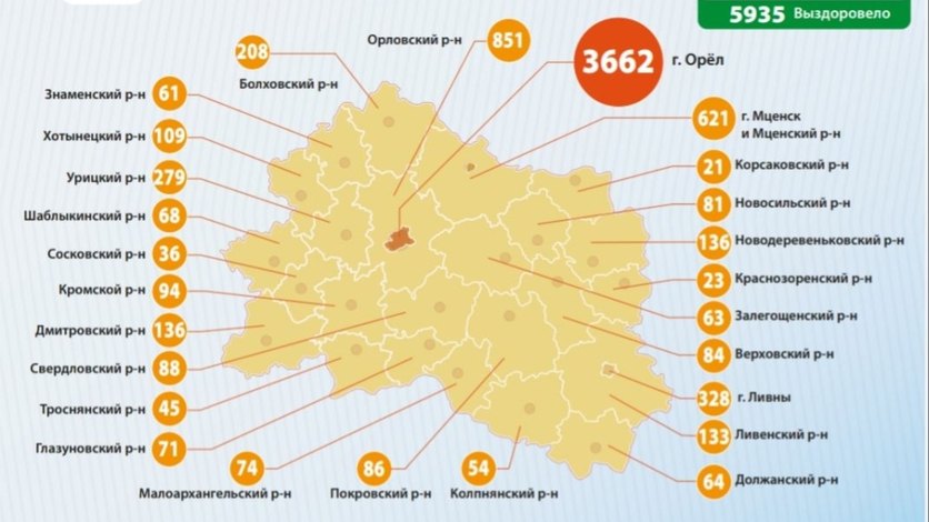 На данный момент COVID-19 подтвержден у 3662 жителей Орла, 851 зараженный – в Орловском районе, 621 – в городе Мценске и Мценском районе, 328 – в Ливнах, 279 – в Урицком районе, 208 – в Болховском районе, по 136 – в Новодеревеньковском и Дмитровском районах, 133 − в Ливенском районе, 109 – в Хотынецком районе, 94 – в Кромском районе, 88 − в Свердловском районе, 86 – в Покровском районе, 84 − в Верховском районе, 81 – в Новосильском районе, 74 – в Малоархангельском районе, 71 – в Глазуновском районе, 68 – в Шаблыкинском районе, 64 – в Должанском районе, 63 – в Залегощенском районе, 61 – в Знаменском районе, 54 – в Колпнянском районе, 45 – в Троснянском районе, 36 – в Сосковском районе, 23 − в Краснозоренском районе, 21 – в Корсаковском районе – отмечено в сообщении информационного портала областной администрации.
